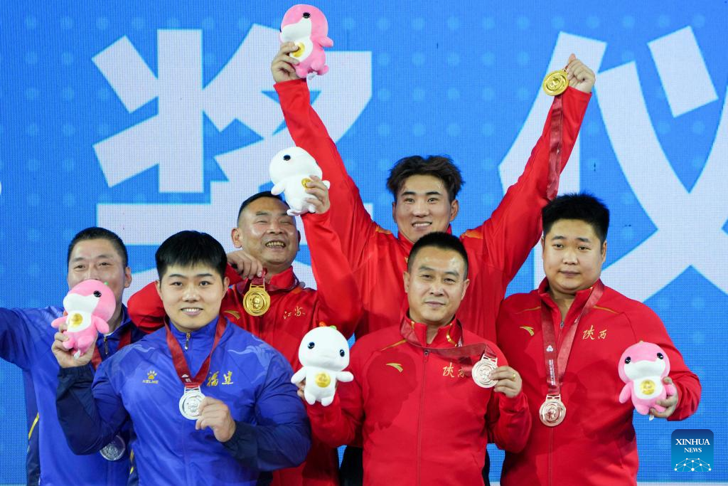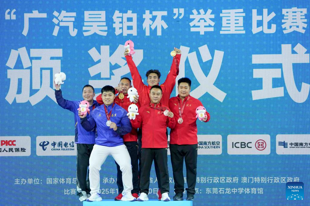 Gold medalist Qian Feixiang of Jiangsu, silver medalist Zhao Yongchao of Fujian and bronze medalist Liu Xinxin of Shaanxi pose with their coaches during the awarding ceremony after the weightlifting men's 96kg final at China's 15th National Games in Dongguan, south China's Guangdong Province, Nov. 19, 2025. (Xinhua/Yang Chenguang)