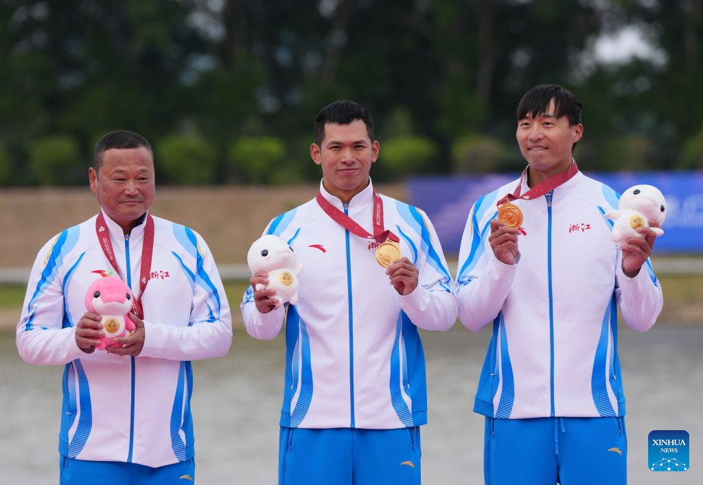 Gold medalists Wang Congkang (C)/Xu Jiawei (R) of Zhejiang pose with their coach during the awarding ceremony for the men's kayak double 500m of canoe sprint at China's 15th National Games in Guangzhou, south China's Guangdong Province, Nov. 19, 2025. (Xinhua/Jigme Dorji)