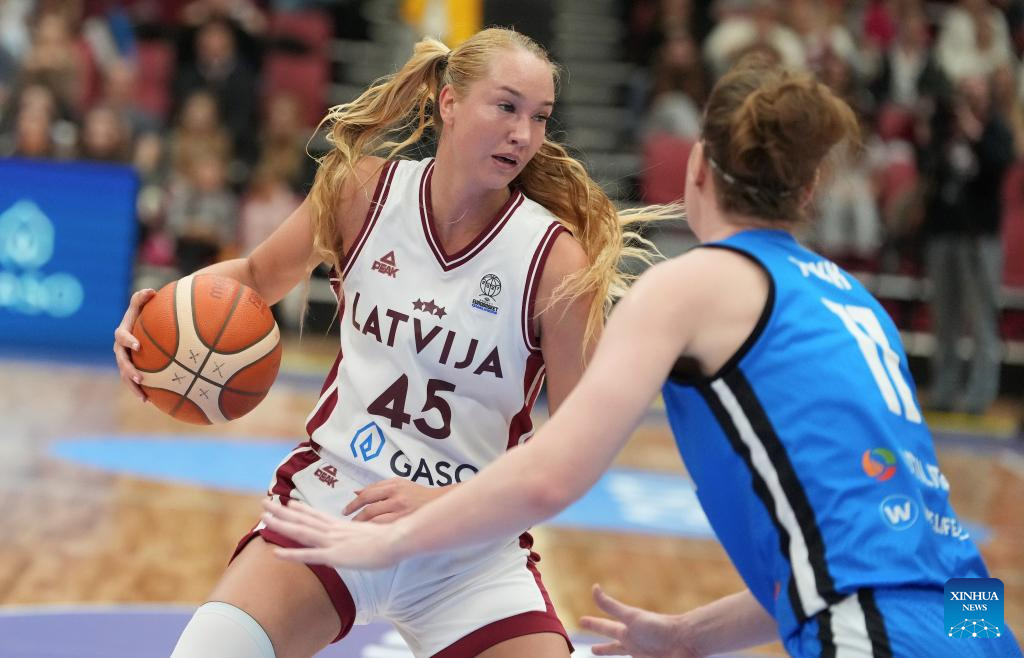 Latvia's Anete Steinberga (front) vies with Estonia's Maaja Bratka during the FIBA Women's EuroBasket 2027 Qualifiers match between Latvia and Estonia in Riga, Latvia. Nov. 18, 2025. (Photo by Edijs Palens/Xinhua)