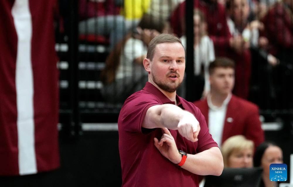 Latvia's head coach Matiss Rozlapa reacts during the FIBA Women's EuroBasket 2027 Qualifiers match between Latvia and Estonia in Riga, Latvia. Nov. 18, 2025. (Photo by Edijs Palens/Xinhua)