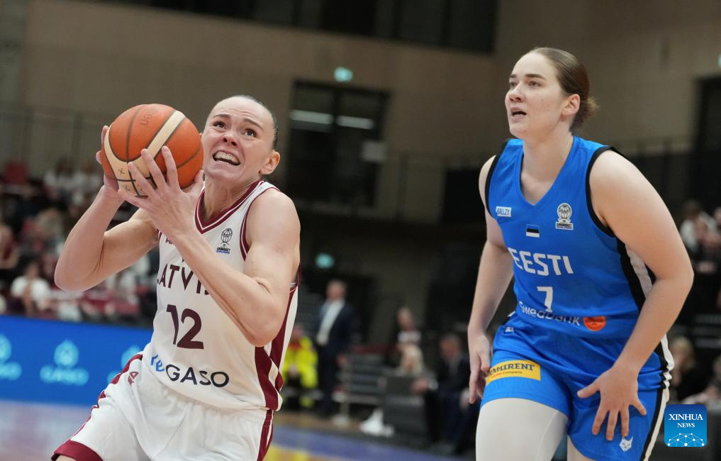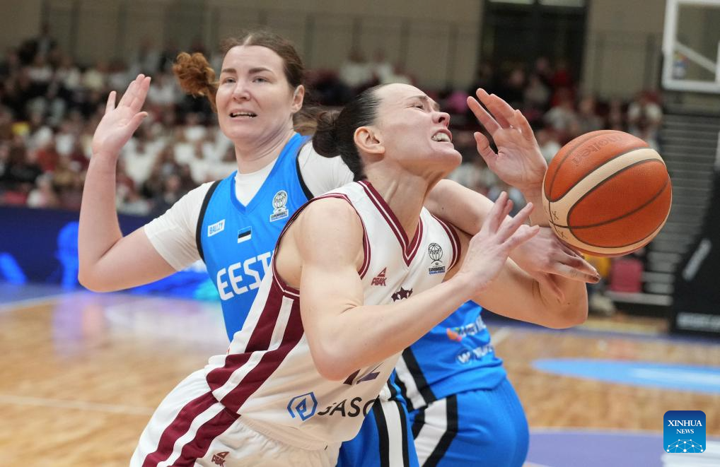 Latvia's Kate Vilka (L) vies with Estonia's Greeta Uprus during the FIBA Women's EuroBasket 2027 Qualifiers match between Latvia and Estonia in Riga, Latvia. Nov. 18, 2025. (Photo by Edijs Palens/Xinhua)