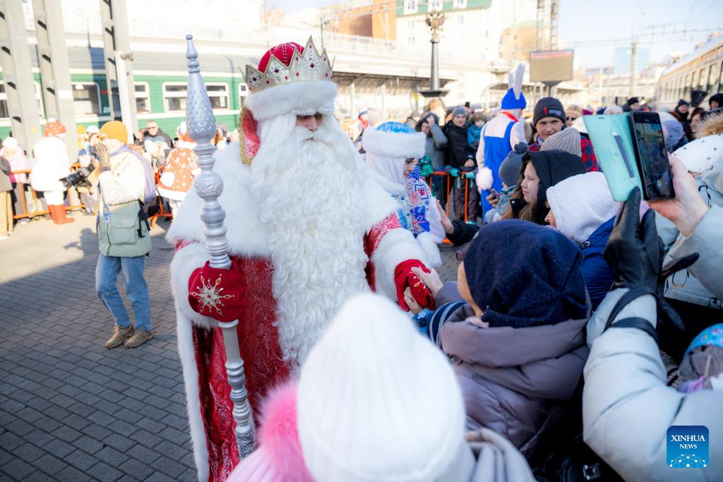 A performer playing the role of "Father Frost" interacts with the audience in Vladivostok, Russia, Nov. 19, 2025. To celebrate Christmas and the New Year, the "Father Frost" train departed from Vladivostok on Nov. 19, embarking on a tour across Russia. The train will pass through approximately 70 cities in Russia, eventually arriving in Veliky Ustyugh, the hometown of "Father Frost." (Photo by Andrey Matveenko/Xinhua)