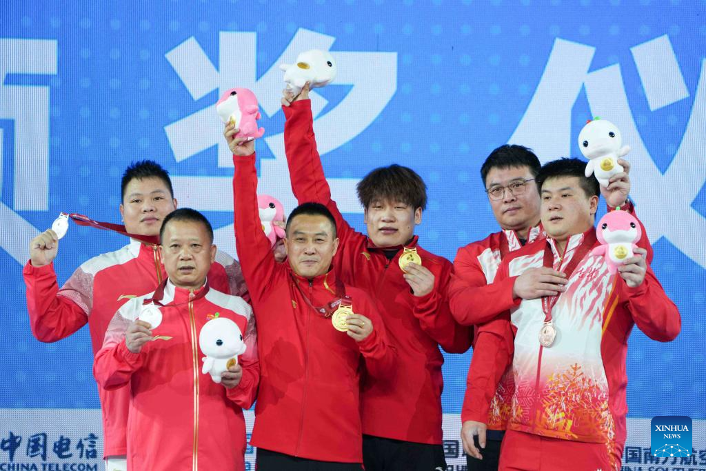 Gold medalist Wang Guizhou of Shaanxi, silver medalist Shi Chanlong of Hunan and bronze medalist Ren Xianglin of Jilin pose with their coaches during the awarding ceremony after the weightlifting men's 109kg final at China's 15th National Games in Dongguan, south China's Guangdong Province, Nov. 20, 2025. (Xinhua/Yang Chenguang)