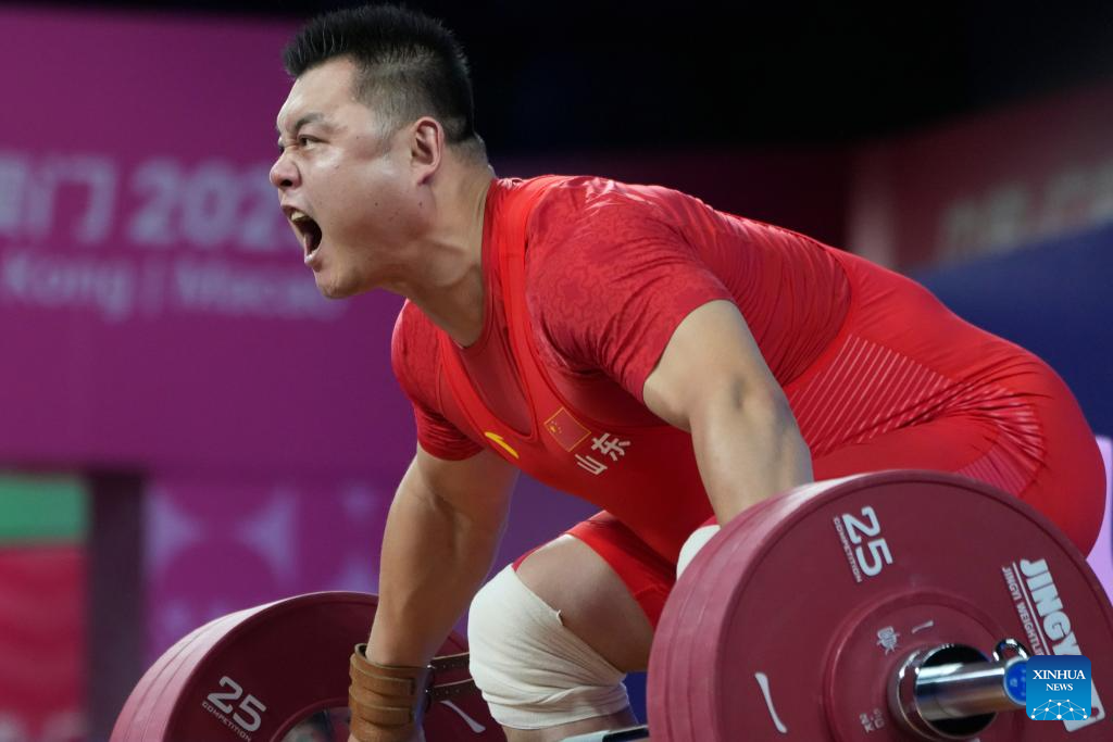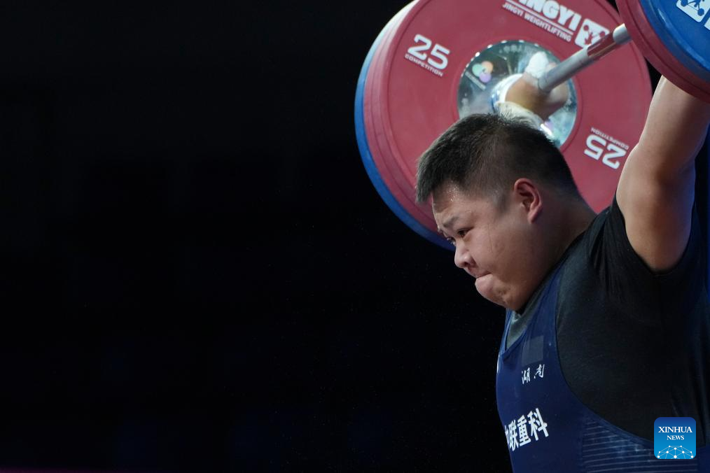 Yang Zhe of Shandong competes in snatch during the weightlifting men's 109kg final at China's 15th National Games in Dongguan, south China's Guangdong Province, Nov. 20, 2025. (Xinhua/Yang Chenguang)
