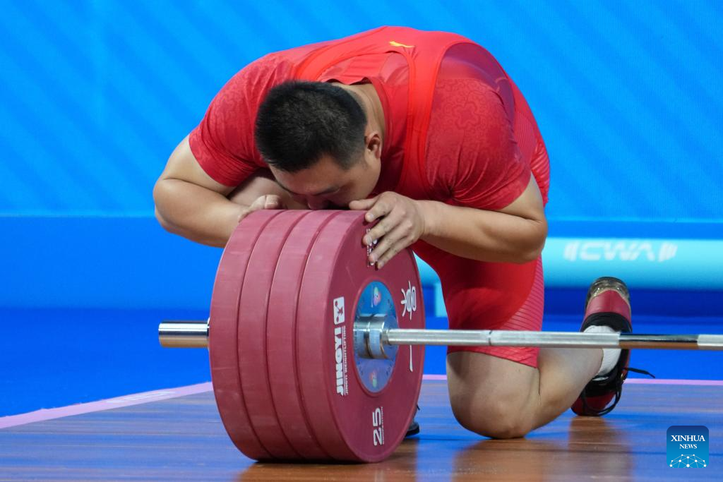 Yang Zhe of Shandong kisses the weights in clean and jerk during the weightlifting men's 109kg final at China's 15th National Games in Dongguan, south China's Guangdong Province, Nov. 20, 2025. (Xinhua/Yang Chenguang)