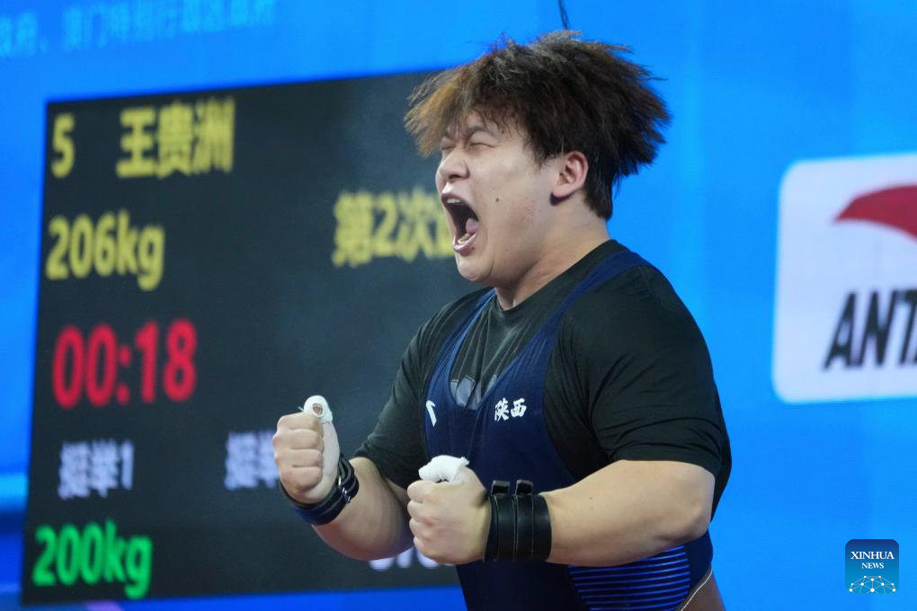 Wang Guizhou of Shaanxi reacts in clean and jerk during the weightlifting men's 109kg final at China's 15th National Games in Dongguan, south China's Guangdong Province, Nov. 20, 2025. (Xinhua/Yang Chenguang)
