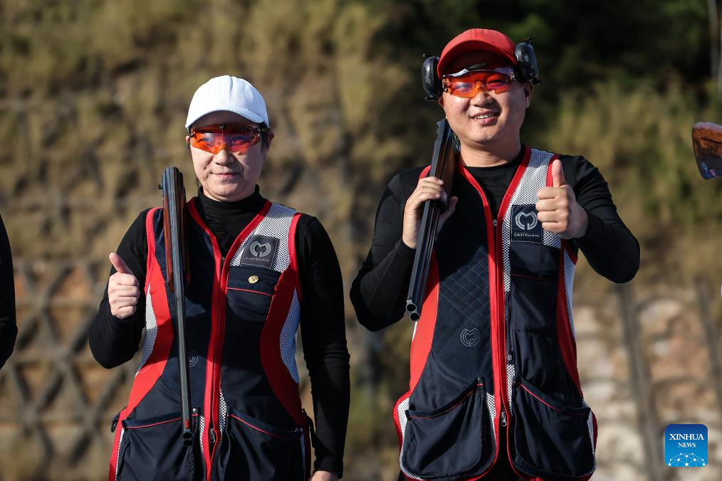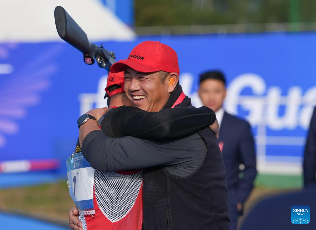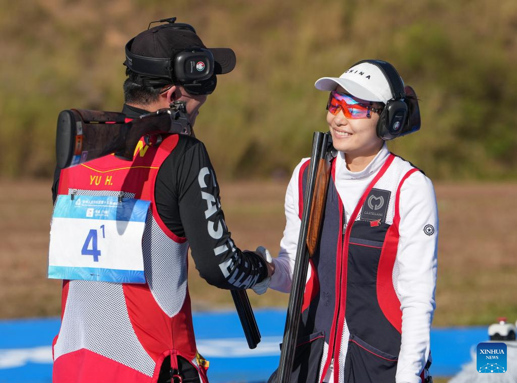 Guo Yuhao (L) celebrates after the trap mixed team final between Guo Yuhao/Liu Yingzi of Hunan and Xiao Jinjia/Duan Yuwei of Shaanxi of shooting at China's 15th National Games in Guangzhou, south China's Guangdong Province, Nov. 20, 2025. (Xinhua/Xiao Ennan)