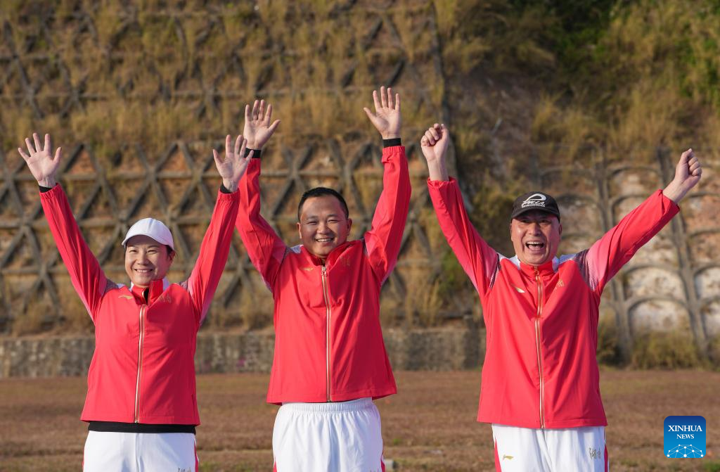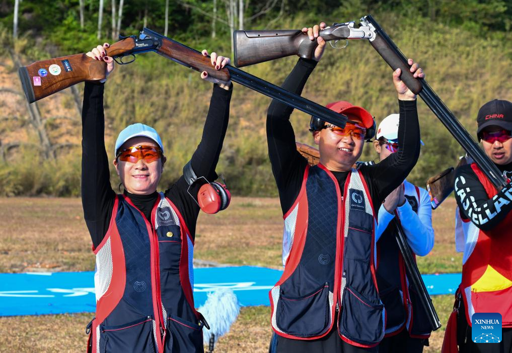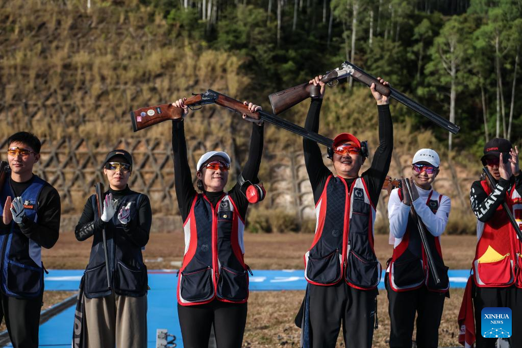 Guo Yuhao (front R)/Liu Yingzi (front L) of Hunan celebrate after the trap mixed team final between Guo Yuhao/Liu Yingzi of Hunan and Xiao Jinjia/Duan Yuwei of Shaanxi of shooting at China's 15th National Games in Guangzhou, south China's Guangdong Province, Nov. 20, 2025. (Xinhua/Xiao Ennan)