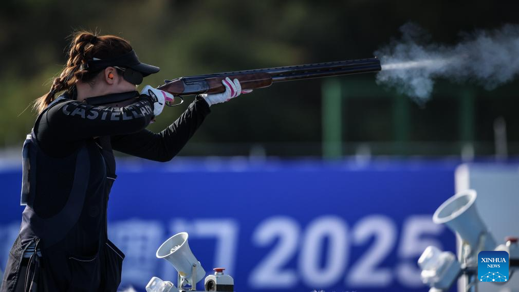 Xiao Jinjia competes during the trap mixed team final between Guo Yuhao/Liu Yingzi of Hunan and Xiao Jinjia/Duan Yuwei of Shaanxi of shooting at China's 15th National Games in Guangzhou, south China's Guangdong Province, Nov. 20, 2025. (Xinhua/Pan Yulong)