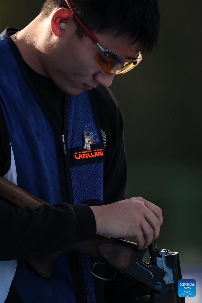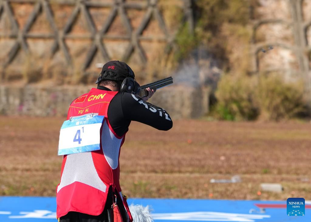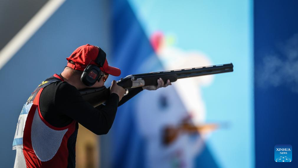 Guo Yuhao of Hunan competes during the trap mixed team final of shooting at China's 15th National Games in Guangzhou, south China's Guangdong Province, Nov. 20, 2025. (Xinhua/Pan Yulong)