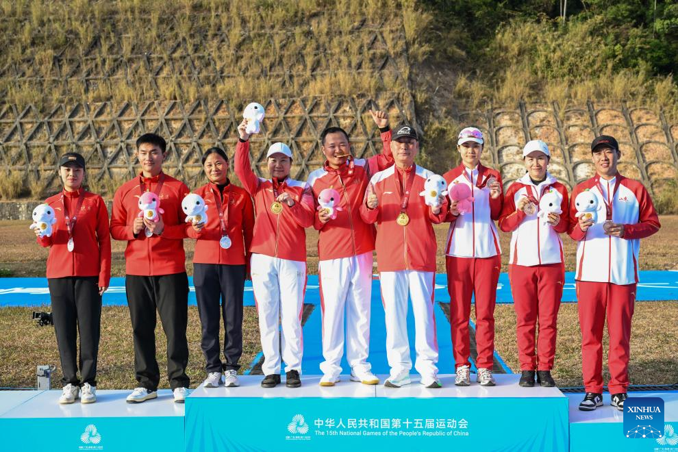 Guo Yuhao (3rd R)/Liu Yingzi (3rd L) of Hunan celebrate after the trap mixed team final of shooting at China's 15th National Games in Guangzhou, south China's Guangdong Province, Nov. 20, 2025. (Xinhua/Pan Yulong)