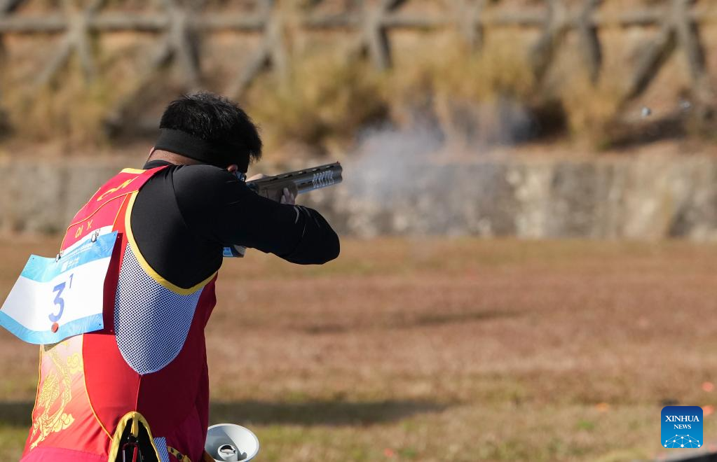 Yu Haicheng competes during the trap mixed team bronze medal match of shooting between Yu Haicheng/Liu Shanshan of Shandong and Qi Ying/Zhu Jingyu of Shandong at China's 15th National Games in Guangzhou, south China's Guangdong Province, Nov. 20, 2025. (Xinhua/Xiao Ennan)