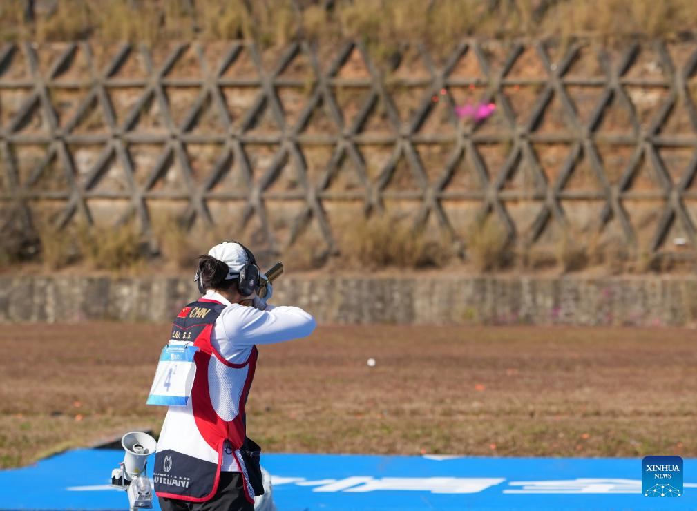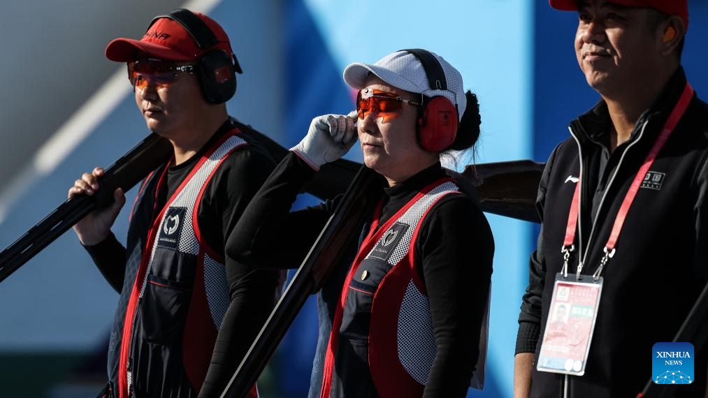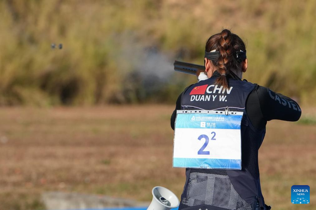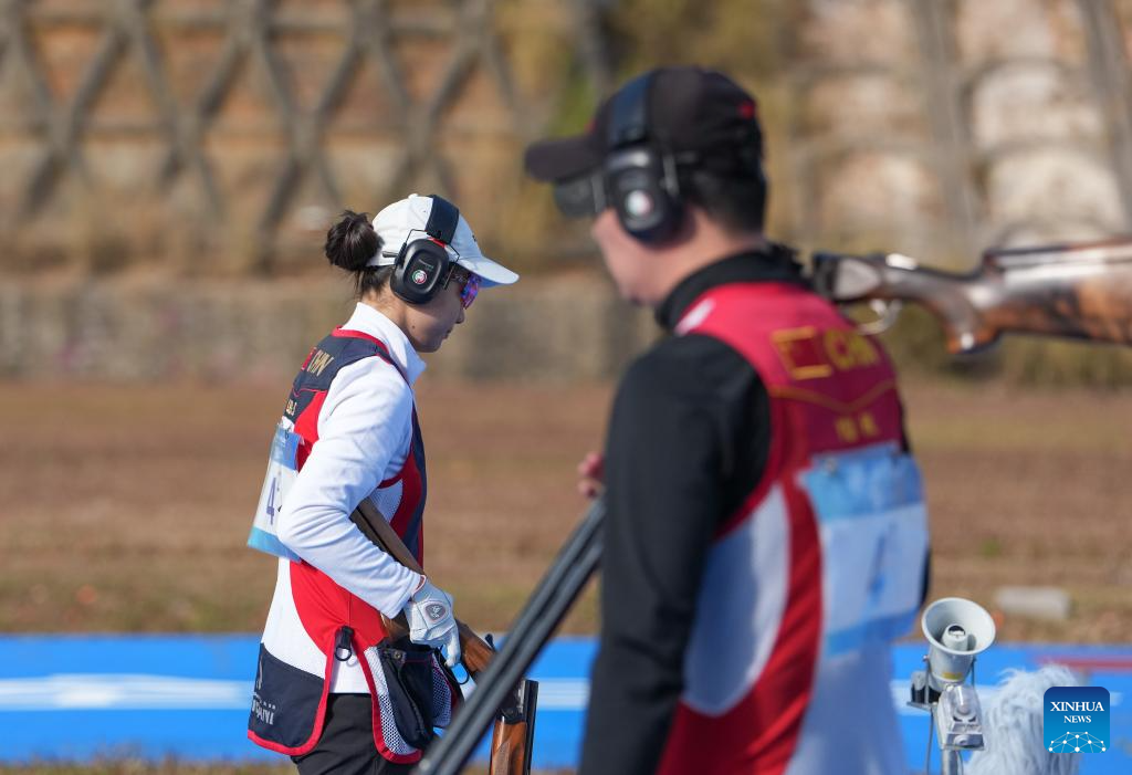 Duan Yuwei competes during the trap mixed team final between Guo Yuhao/Liu Yingzi of Hunan and Xiao Jinjia/Duan Yuwei of Shaanxi of shooting at China's 15th National Games in Guangzhou, south China's Guangdong Province, Nov. 20, 2025. (Xinhua/Xiao Ennan)