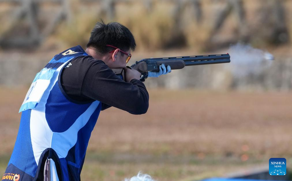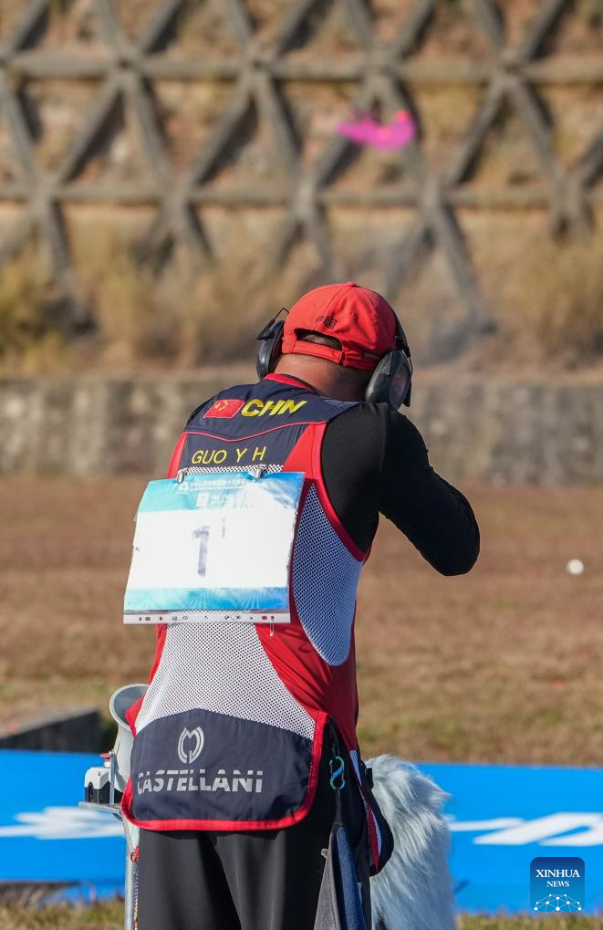 Guo Yuhao competes during the trap mixed team final between Guo Yuhao/Liu Yingzi of Hunan and Xiao Jinjia/Duan Yuwei of Shaanxi of shooting at China's 15th National Games in Guangzhou, south China's Guangdong Province, Nov. 20, 2025. (Xinhua/Xiao Ennan)