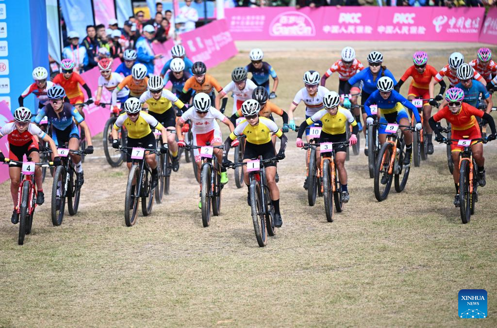Athletes start during the women's cross-country final of cycling mountain bike at China's 15th National Games in Jiangmen, south China's Guangdong Province, Nov. 20, 2025. (Xinhua/Chen Zhonghao)