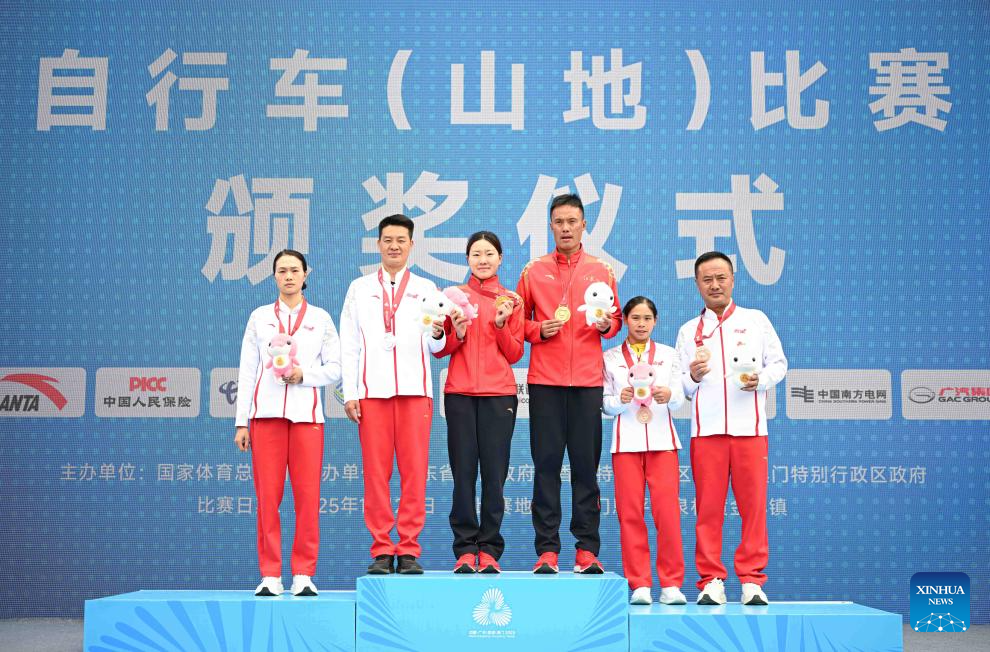 Gold medalist Wei Qianqian (3rd L) of Jiangsu, silver medalist Wu Zhifan (1st L) of Yunnan and bronze medalist Liang Zhenglan (2nd R) of Yunnan pose with their coaches during the awarding ceremony for the women's cross-country of cycling mountain bike at China's 15th National Games in Jiangmen, south China's Guangdong Province, Nov. 20, 2025. (Xinhua/Chen Zhonghao)