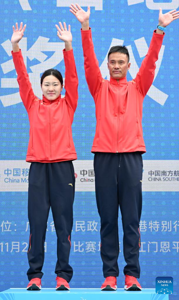 Gold medalist Wei Qianqian (L) of Jiangsu celebrates with her coach during the awarding ceremony for the women's cross-country of cycling mountain bike at China's 15th National Games in Jiangmen, south China's Guangdong Province, Nov. 20, 2025. (Xinhua/Chen Zhonghao)
