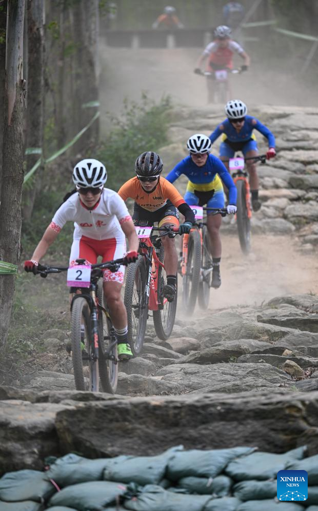 Athletes compete during the women's cross-country final of cycling mountain bike at China's 15th National Games in Jiangmen, south China's Guangdong Province, Nov. 20, 2025. (Xinhua/Chen Zhonghao)