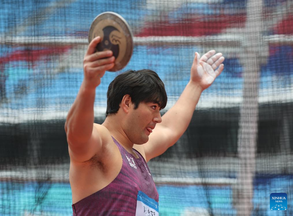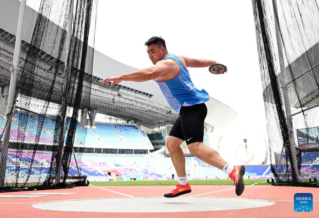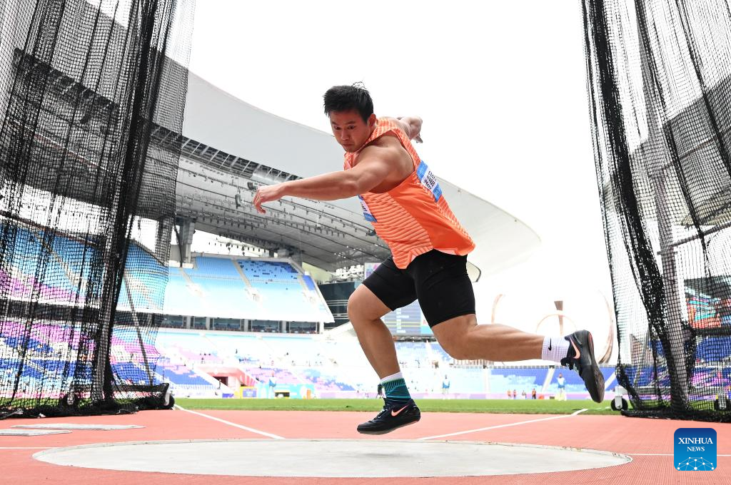 Zhu Jiacheng of Zhejiang competes during the men's discus throw final of athletics at China's 15th National Games in Guangzhou, south China's Guangdong Province, Nov. 20, 2025. (Xinhua/Jiang Han)