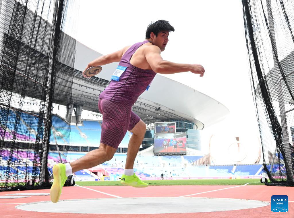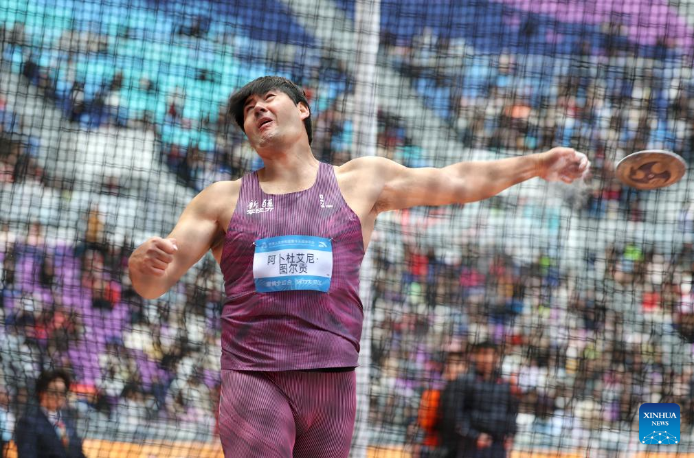 Abuduaini Tuergong of Xinjiang competes during the men's discus throw final of athletics at China's 15th National Games in Guangzhou, south China's Guangdong Province, Nov. 20, 2025. (Xinhua/Jiang Han)