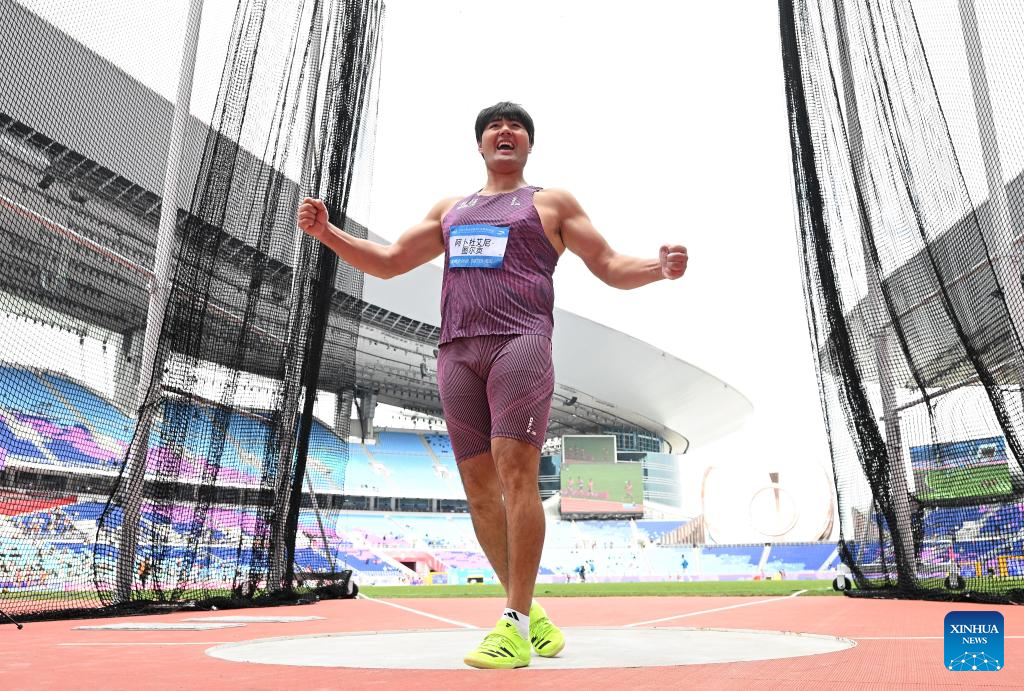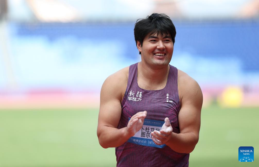 Abuduaini Tuergong of Xinjiang celebrates during the men's discus throw final of athletics at China's 15th National Games in Guangzhou, south China's Guangdong Province, Nov. 20, 2025. (Xinhua/Jiang Han)