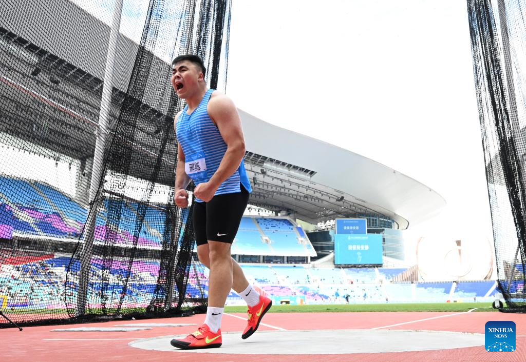 Xing Jiadong of Shandong reacts during the men's discus throw final of athletics at China's 15th National Games in Guangzhou, south China's Guangdong Province, Nov. 20, 2025. (Xinhua/Jiang Han)