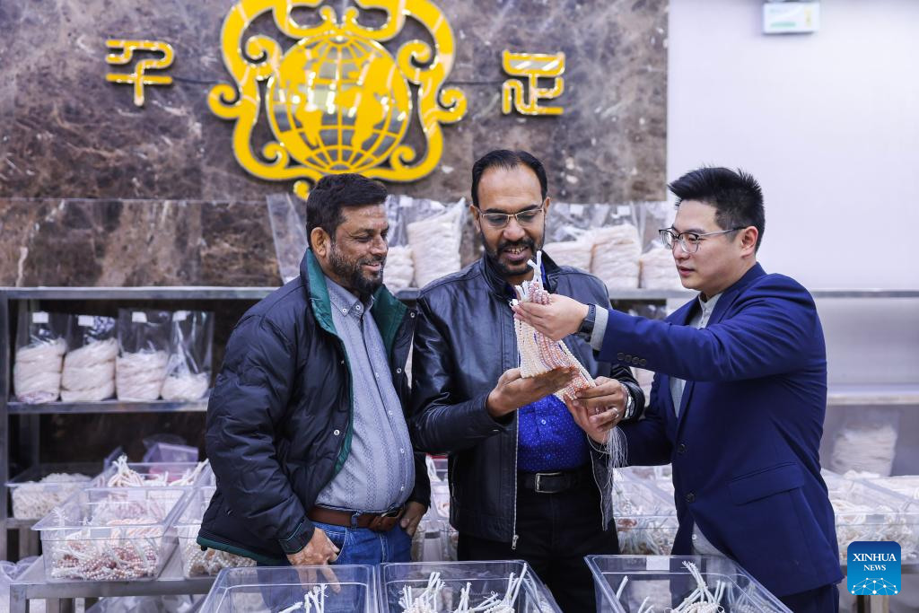 A tour guide (R) introduces pearls to Pakistani tourists at a jewelry mall in Shanxiahu Town of Zhuji, east China's Zhejiang Province, Nov. 20, 2025. In recent years, Zhuji has been actively building a high-quality tour guide team, with measures such as skill training and excellent tour guide selection, so as to provide tourists with an in-depth and warm experience and improve local tourism. (Xinhua/Xu Yu)