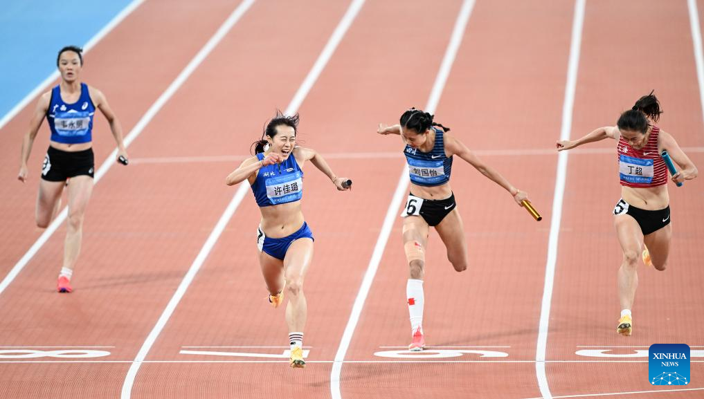 Athletes compete during the women's 4x100m relay final of athletics at China's 15th National Games in Guangzhou, south China's Guangdong Province, Nov. 20, 2025. (Xinhua/Deng Hua)