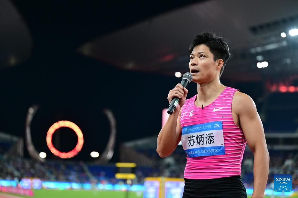 Su Bingtian of team Guangdong delivers a speech after the men's 4x100m relay final of athletics at China's 15th National Games in Guangzhou, south China's Guangdong Province, Nov. 20, 2025. (Xinhua/Jiang Han)