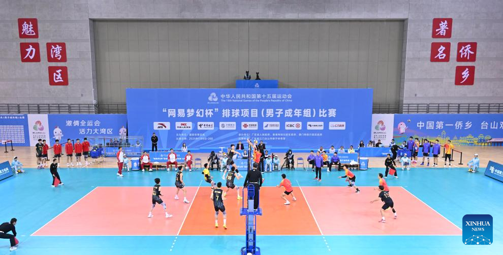 Players of both sides compete during the volleyball men's final between Fujian and Shandong at China's 15th National Games in Jiangmen, south China's Guangdong Province, Nov. 19, 2025. (Xinhua/Li Xin)