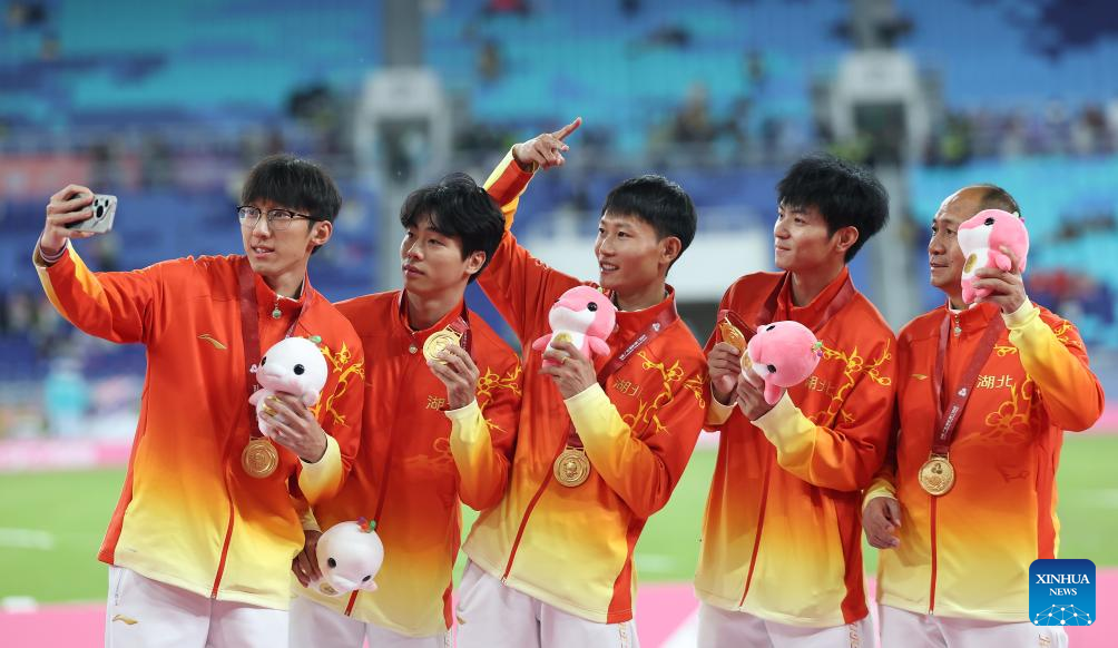 Gold medalists team Hubei pose for a selfie with their coach after the awarding ceremony for the men's 4x100m relay of athletics at China's 15th National Games in Guangzhou, south China's Guangdong Province, Nov. 20, 2025. (Xinhua/Huang Wei)