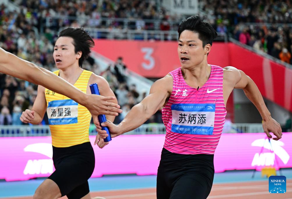 Su Bingtian (R) of team Guangdong competes during the men's 4x100m relay final of athletics at China's 15th National Games in Guangzhou, south China's Guangdong Province, Nov. 20, 2025. (Xinhua/Jiang Han)
