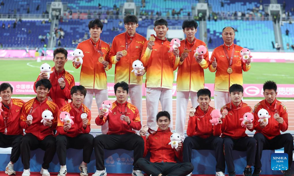 Gold medalists team Hubei, silver medalists team Jiangxi and bronze medalists team Jiangsu pose with their coaches during the awarding ceremony for the men's 4x100m relay of athletics at China's 15th National Games in Guangzhou, south China's Guangdong Province, Nov. 20, 2025. (Xinhua/Huang Wei)