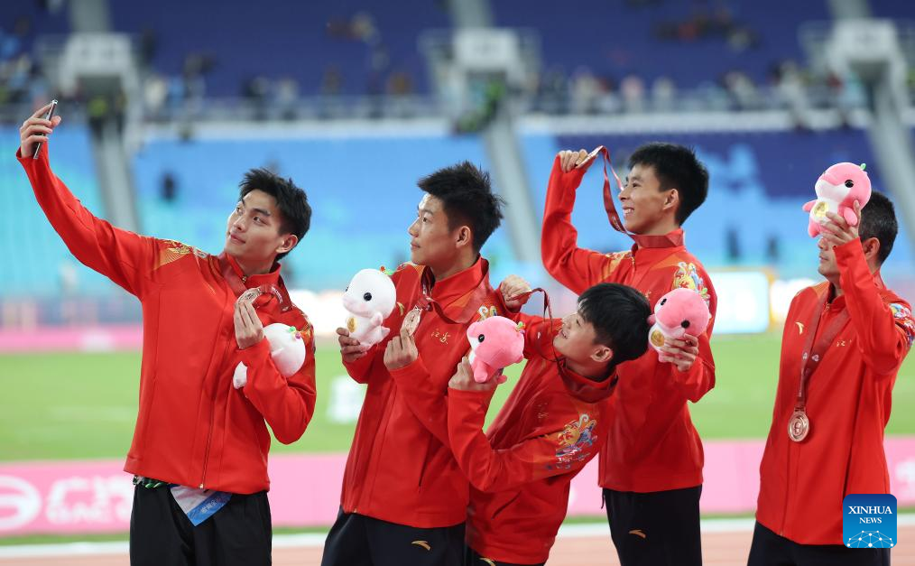 Bronze medalists team Jiangsu pose for a selfie with their coach after the awarding ceremony for the men's 4x100m relay of athletics at China's 15th National Games in Guangzhou, south China's Guangdong Province, Nov. 20, 2025. (Xinhua/Huang Wei)