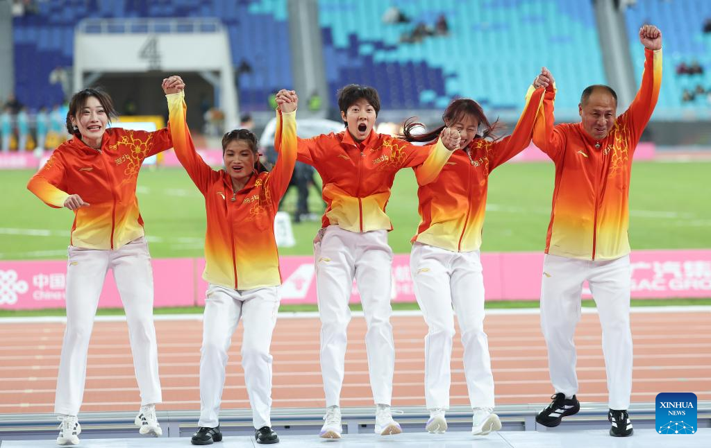 Gold medalists team Hubei and their coach react during the awarding ceremony for the women's 4x100m relay of athletics at China's 15th National Games in Guangzhou, south China's Guangdong Province, Nov. 20, 2025. (Xinhua/Huang Wei)