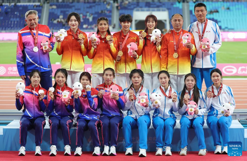 Gold medalists team Hubei, silver medalists team Shanghai and bronze medalists team Zhejiang pose with their coaches during the awarding ceremony for the women's 4x100m relay of athletics at China's 15th National Games in Guangzhou, south China's Guangdong Province, Nov. 20, 2025. (Xinhua/Huang Wei)