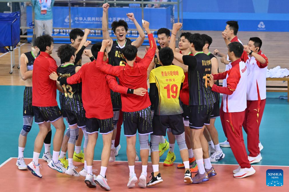 Team Shandong celebrate after the volleyball men's final between Fujian and Shandong at China's 15th National Games in Jiangmen, south China's Guangdong Province, Nov. 20, 2025. (Xinhua/Li Xin)