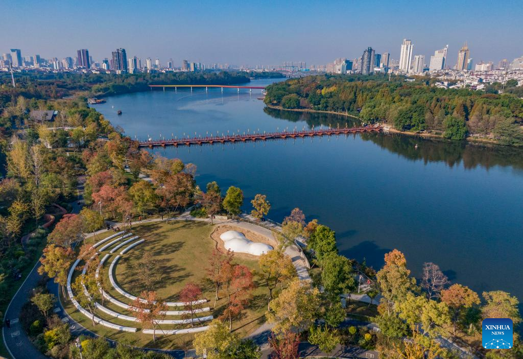 An aerial drone photo taken on Nov. 20, 2025 shows a view of a park in Jinhua, east China's Zhejiang Province. (Photo by Shi Kuanbing/Xinhua)