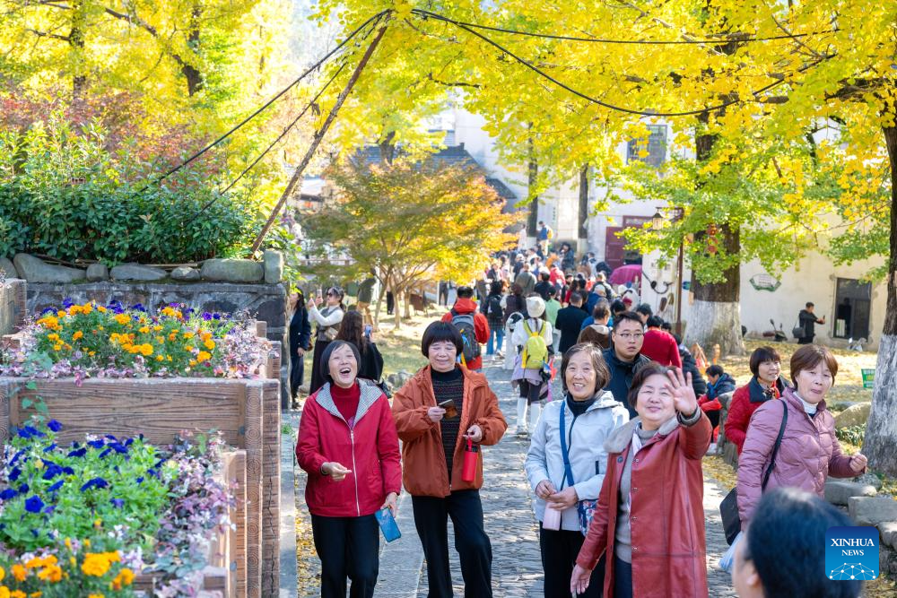 Tourists visit a scenic spot featuring ginkgo trees in Xiaopu Town of Changxing County in Huzhou City, east China's Zhejiang Province, Nov. 20, 2025. (Photo by Tan Yunfeng/Xinhua)