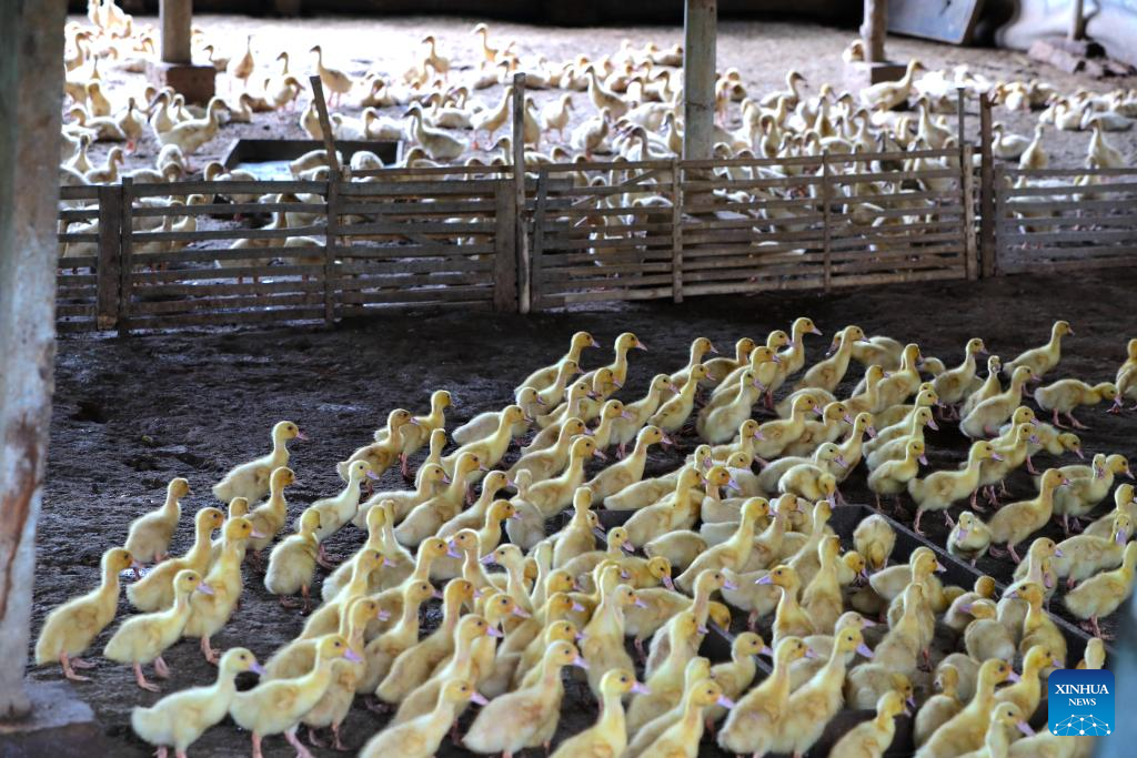 This photo taken on Nov. 13, 2025 shows ducks raised by Purwosono villagers at Purwosono Village, East Java, Indonesia. (Xinhua/Cen Yunpeng)