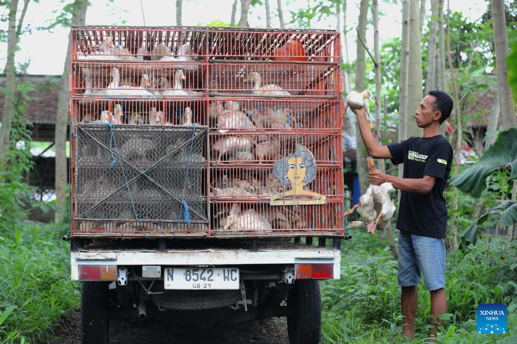 Ducks raised by Purwosono villagers are loaded onto a truck at Purwosono Village, East Java, Indonesia, Nov. 13, 2025. (Xinhua/Cen Yunpeng)