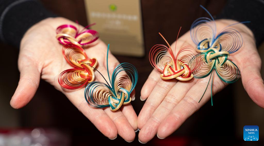 This photo taken on Nov. 21, 2025 shows bamboo weaving artworks at an exhibition held at the Sensory Experience Gallery of the Palace Museum in Beijing, capital of China. Featuring artworks created by disabled artists from Shanghai, the exhibition kicked off here on Friday. Under the guidance of inheritors of intangible cultural heritages, these artists infused their love for life and reverence for culture into their works. (Xinhua/Cai Yang)