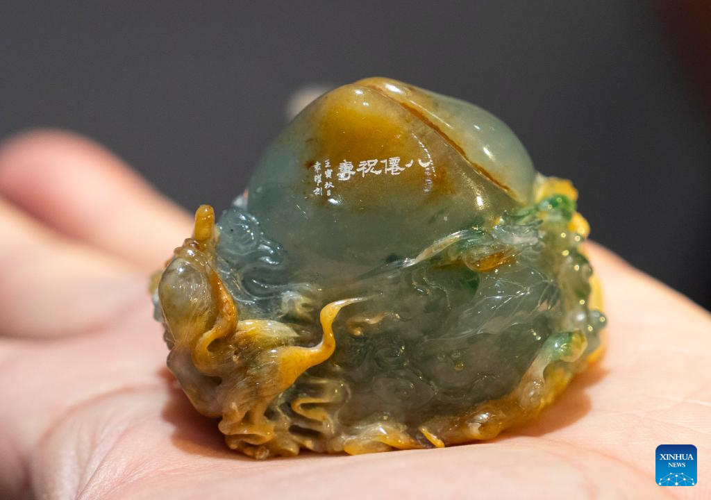 This photo taken on Nov. 21, 2025 shows a jade sculpture at an exhibition held at the Sensory Experience Gallery of the Palace Museum in Beijing, capital of China. Featuring artworks created by disabled artists from Shanghai, the exhibition kicked off here on Friday. Under the guidance of inheritors of intangible cultural heritages, these artists infused their love for life and reverence for culture into their works. (Xinhua/Cai Yang)