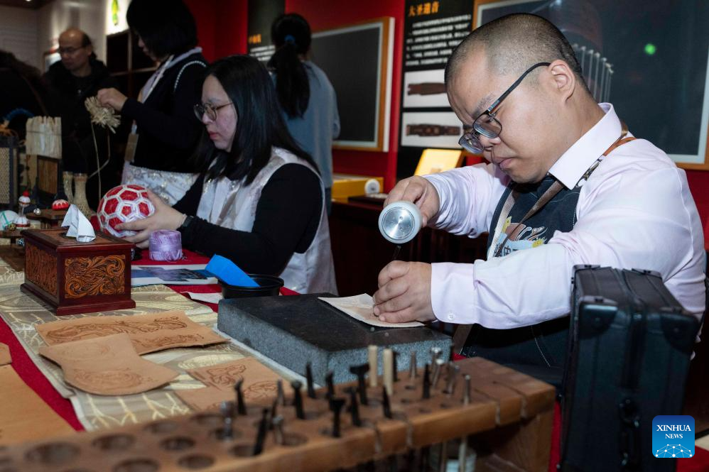 A disabled artist (R) demonstrates leather carving skills during an exhibition held at the Sensory Experience Gallery of the Palace Museum in Beijing, capital of China, Nov. 21, 2025. Featuring artworks created by disabled artists from Shanghai, the exhibition kicked off here on Friday. Under the guidance of inheritors of intangible cultural heritages, these artists infused their love for life and reverence for culture into their works. (Xinhua/Cai Yang)
