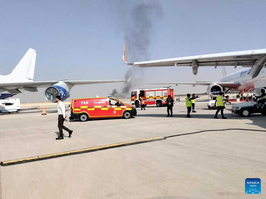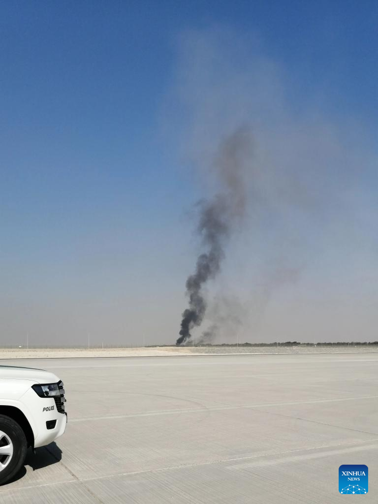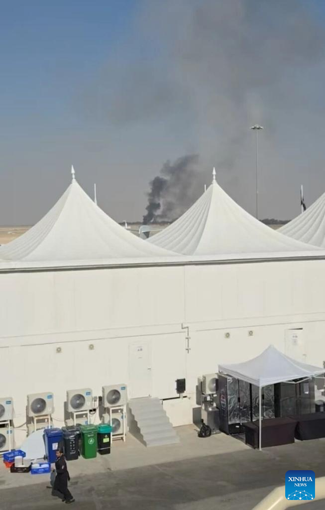 Smoke billows from the site of an aircraft crash during a demonstration at the Dubai Air Show in Dubai, the United Arab Emirates (UAE), Nov. 21, 2025. An Indian aircraft crashed on Friday during a demonstration at the Dubai Air Show, killing the pilot. The Indian HAL Tejas fighter jet crashed around 2:10 p.m. local time (1010 GMT) while flying a demonstration flight. (Xinhua)
