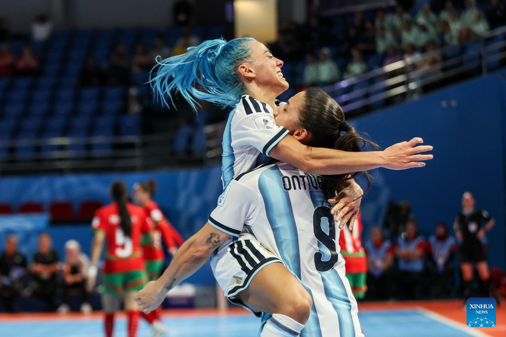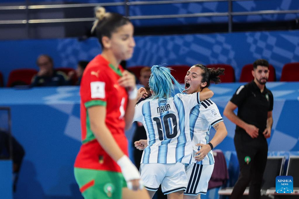 Silvina Nava (L) and Ana Ontiveros of Argentina celebrate after scoring a goal during the match between Argentina and Morocco at the FIFA Futsal Women's World Cup 2025 in Pasig City, the Philippines, Nov. 21, 2025. (Xinhua/Rouelle Umali)