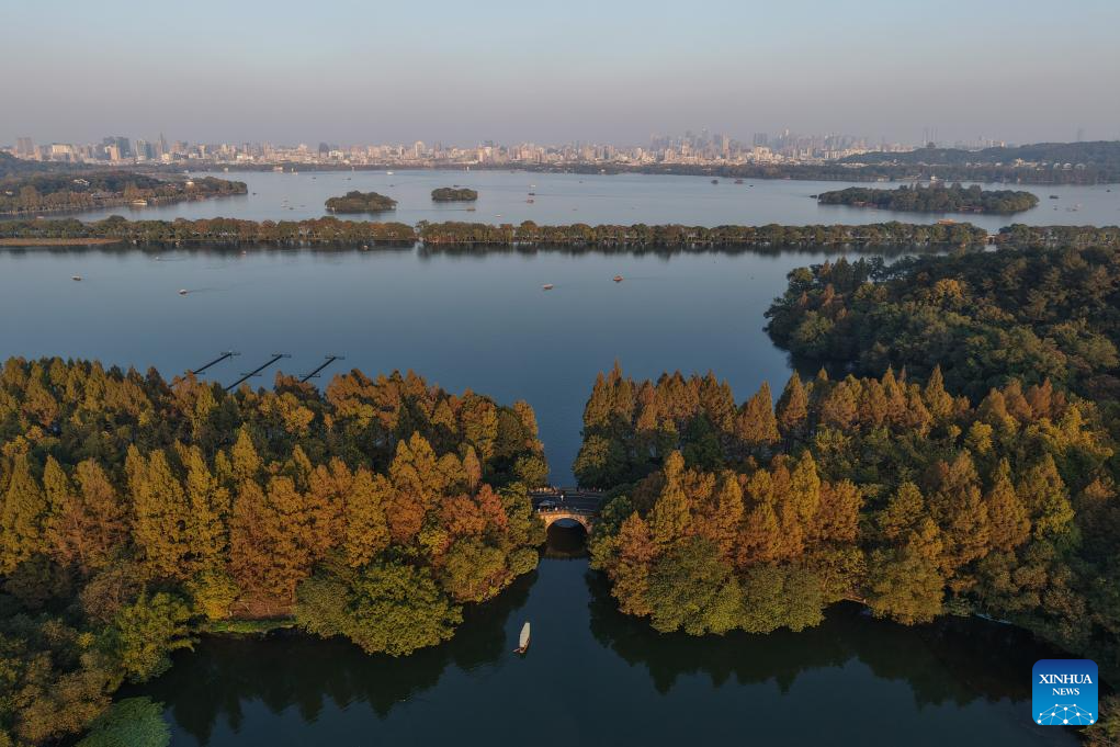 An aerial drone photo shows a view of the West Lake scenic area in Hangzhou, east China's Zhejiang Province, Nov. 21, 2025. (Xinhua/Huang Zongzhi)