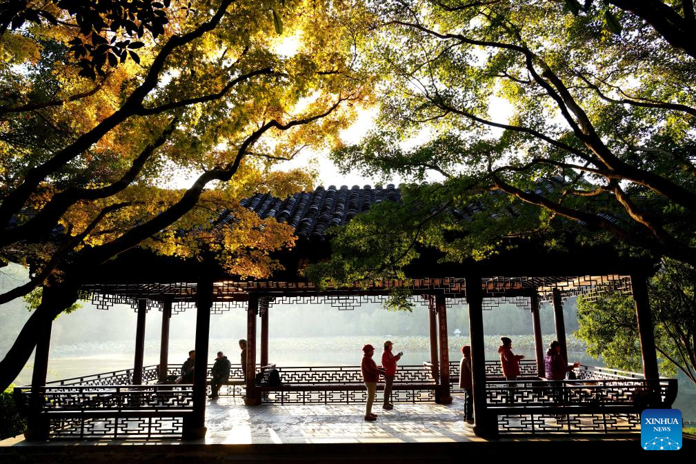 Tourists do morning exercise in a pavilion in the West Lake scenic area in Hangzhou, east China's Zhejiang Province, Nov. 21, 2025. (Photo by Zhuang Yingchang/Xinhua)