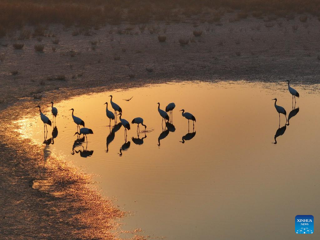 A drone photo shows cranes at a wetland park in Lianyungang, east China's Jiangsu Province, Nov. 21, 2025. (Photo by Si Wei/Xinhua)