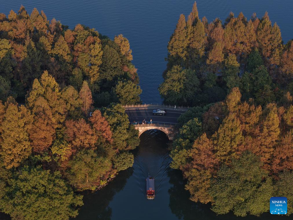 An aerial drone photo shows cars running on the Yanggongdi Causeway, with a boat sailing beneath it, in the West Lake scenic area in Hangzhou, east China's Zhejiang Province, Nov. 21, 2025. (Xinhua/Huang Zongzhi)